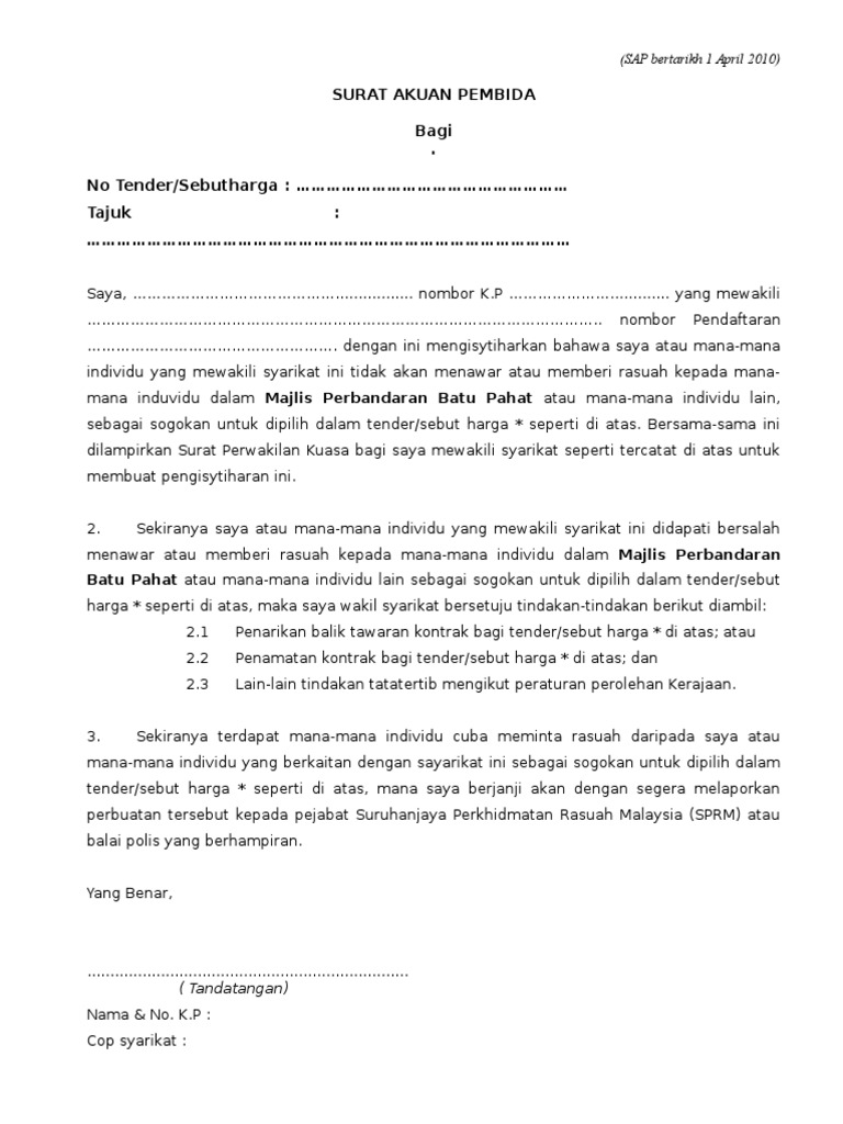 11 - dokumen 5 surat akuan pembida sl1m 3 16 1 11 -pengesahan pembida. Sebutharga Garaj Bas 2 Pdf. Surat pemberitahuan sebutharga tidak berjaya 27818 r.